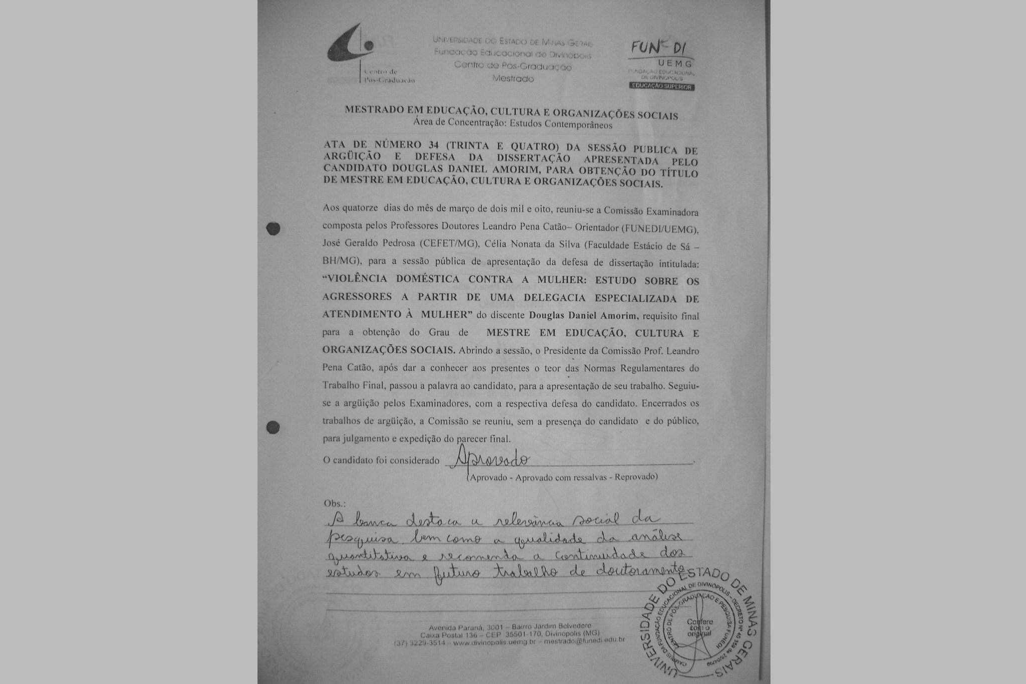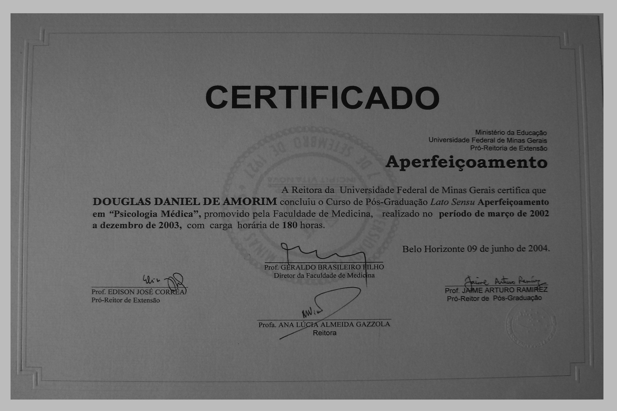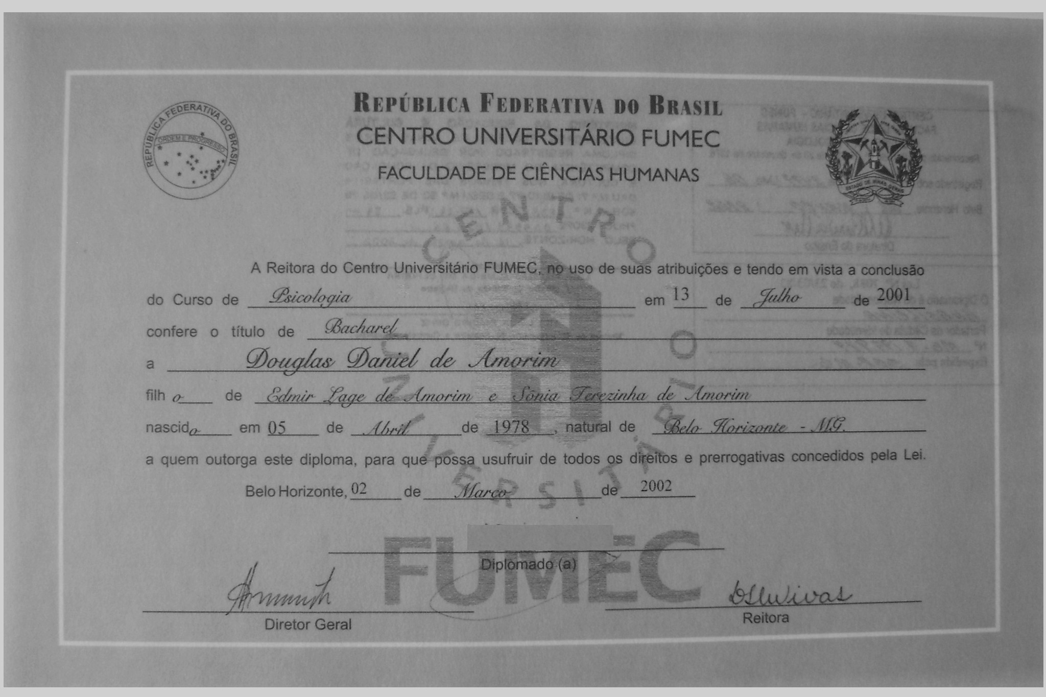 Após concluir minha graduação, participei do processo seletivo para fazer Pós-graduação em Psicologia Médica, pelo departamento de Psiquiatria e Neurologia da Faculdade de Medicina da Universidade Federal de Minas Gerais (UFMG) e fui aprovado. Após dois anos de curso, resolvi que gostaria de realizar um estudo em nível mais aprofundado. Foi então que resolvi participar da seleção para o Mestrado em Educação, Cultura e Organizações Sociais da Universidade do Estado de Minas Gerais (UEMG). A ideia de fazer um Mestrado fora da Psicologia foi estratégica. Depois de estudar tanto os mecanismos psíquicos do ser humano, desta vez, quis estudar como a cultura e a sociedade, poderiam interferir no comportamento das pessoas. Fui selecionado em segundo lugar, obtendo 378 pontos, dos 400 possíveis, no ano de 2005 e finalizei-o em março de 2008. Minha dissertação de Mestrado foi sobre violência contra a mulher pode ser baixada aqui no site. Basta clicar nela para ter acesso ao seu conteúdo integral, em pdf. Em meados de 2016 ingressei no Doutorado em Psicologia Cognitiva pela Bircham International University, da Espanha. Desta vez meu tema de pesquisa foi voltado para o vício em internet e telefone celular, e seu conteúdo, assim como o da dissertação, pode ser baixado aqui no site, no link específico. Também estão exibidas logo abaixo, as atas da defesa do Mestrado e do Doutorado.